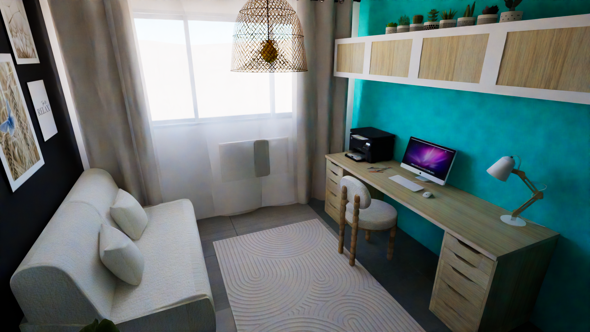 Ensuite, j’ai réalisé des vues 3D réalistes afin de lui permettre de visualiser concrètement son futur bureau, dans une configuration optimisée et harmonieuse.