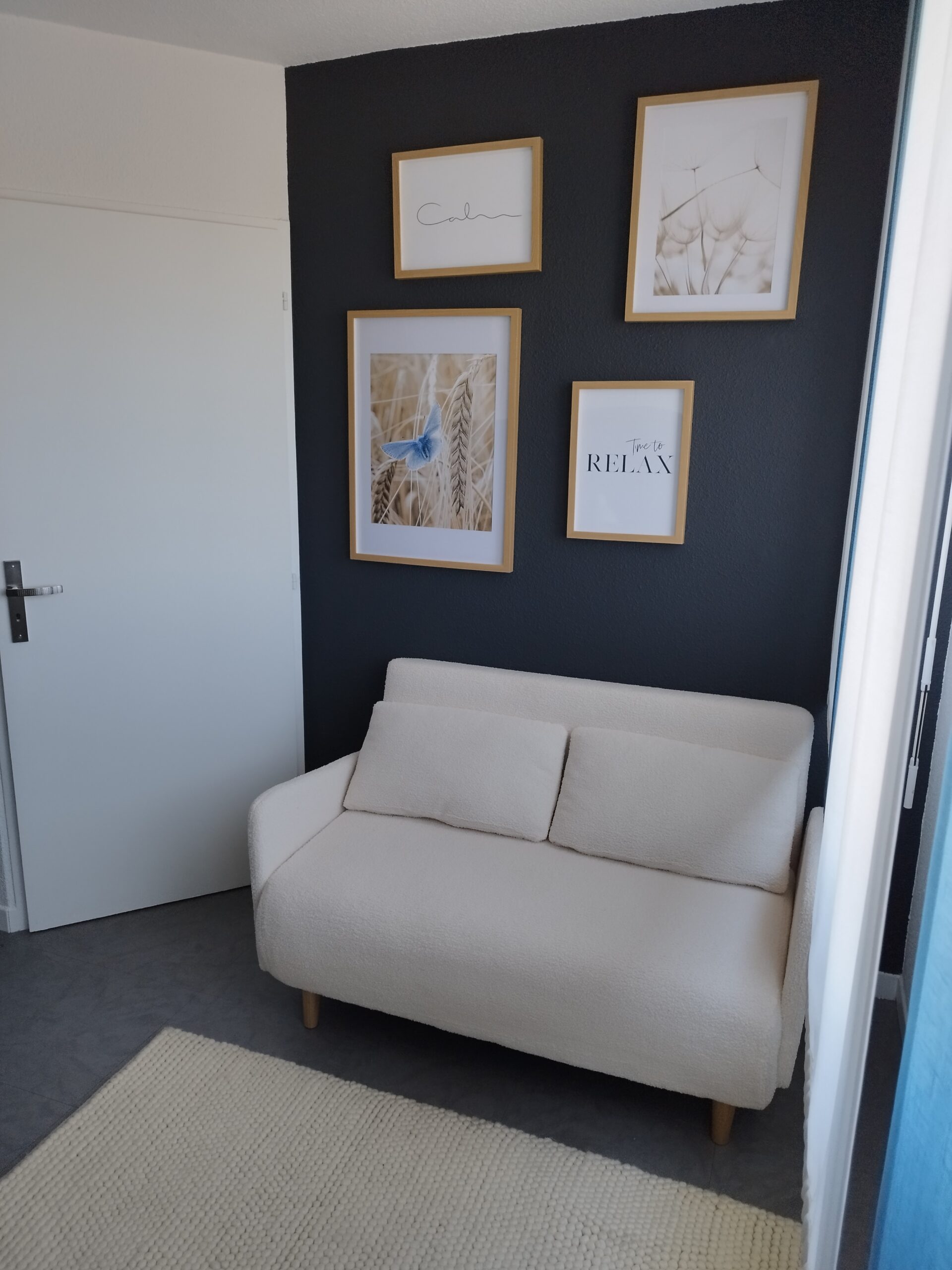 Une touche cocooning avec un tapis en laine, un plaid en fausse fourrure, des coussins et des tableaux, pour apporter chaleur et confort.
